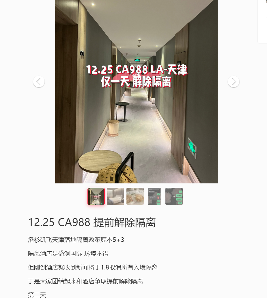 虽然现在还没到1月8日,但是有网友在小红书上分享称,自己在12月25日在抵达天津时通过一起和隔离的人争取,已经提前取消了隔离,最终只在酒店隔离了一天。