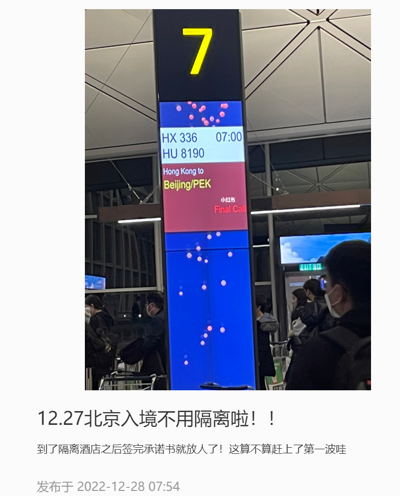 27日抵达北京的旅客则表示,只要签下承诺书,就可以免去酒店隔离直接回家!