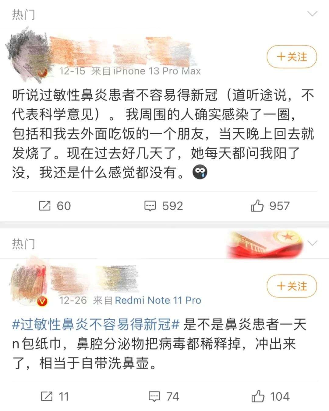 当然,也有人叠加了鼻炎和新冠双重伤害,一边流鼻涕一边感染……