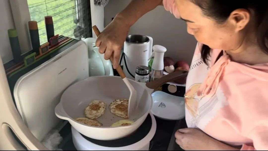〓 苏敏在房车内做早餐 。殷盛琳 摄