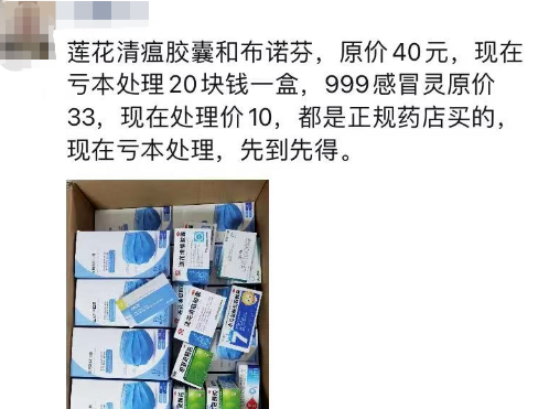 还有人已经在朋友圈低价处理连花清瘟胶囊和布洛芬了,原价40元,现在20块钱一盒……