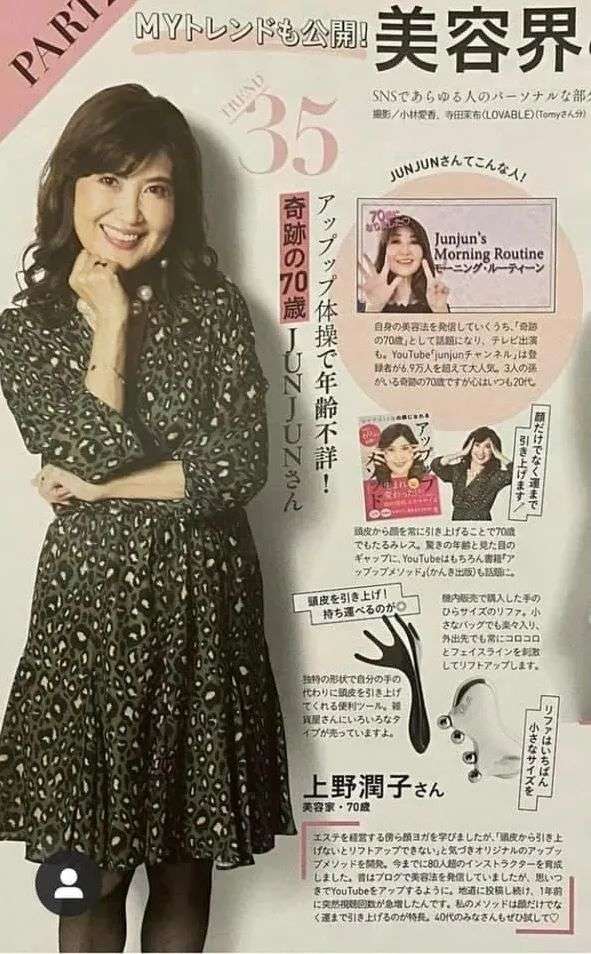 这位女士名叫上野润子,是一位美妆保养类的博主,同时经营着自己的美容院和买手店。自从64岁那年参加美魔女大赛一赛成名,她便出书,上节目,开自己的美容课,成为了美魔女界的红人。