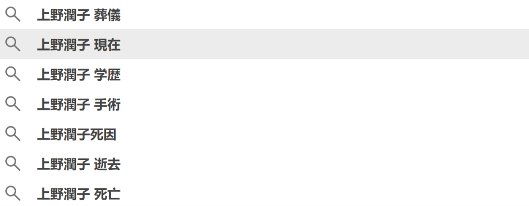 在这里也要和大家分享一个悲伤的消息,上野润子2021年罹患咽喉癌并接受了手术,但今年病情恶化,再次入院,据传在2022年的6月份去世。目前在搜索框中搜索“上野润子”,排名第一位的就是葬礼。
