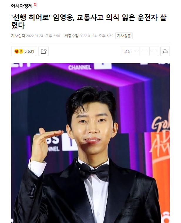 去年1月,韩国Trot歌手林英雄在结束行程的归途中目睹了前往车辆撞上护栏的场面。距离最近的林英雄在看到事故司机昏迷倒下后立刻报了案,并对司机进行了CPR(心脏复苏术)等应急处理,确认司机恢复意识后还给他盖上了毯子。