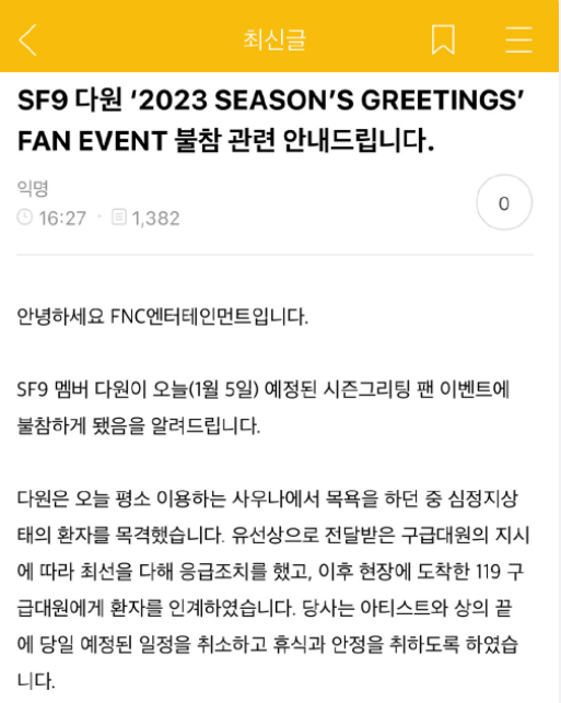 本月5日,韩国男子组合SF9所属经纪公司FNC通过SF9官方粉丝俱乐部发布公告称:“SF9成员达渊将缺席今天的 SEASON'S GREETINGS粉丝活动。”