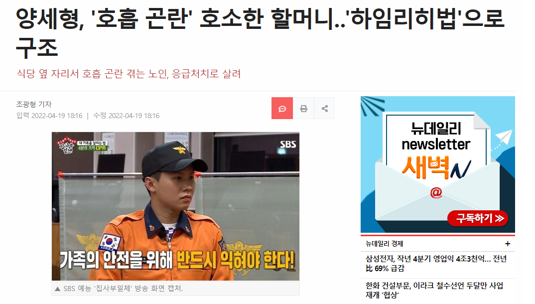 去年4月,韩国喜剧演员兼主持人梁世炯也曾通过适当的应急措施挽救了生命。