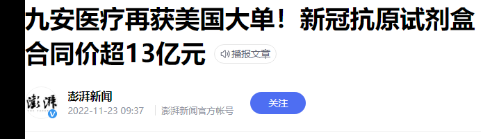 2022年11月23日,九安医疗的美国子公司又拿到了美国国防部后勤局(DLA)1.91亿美元(差不多13亿元人民币)的核酸抗原试剂盒订单。
