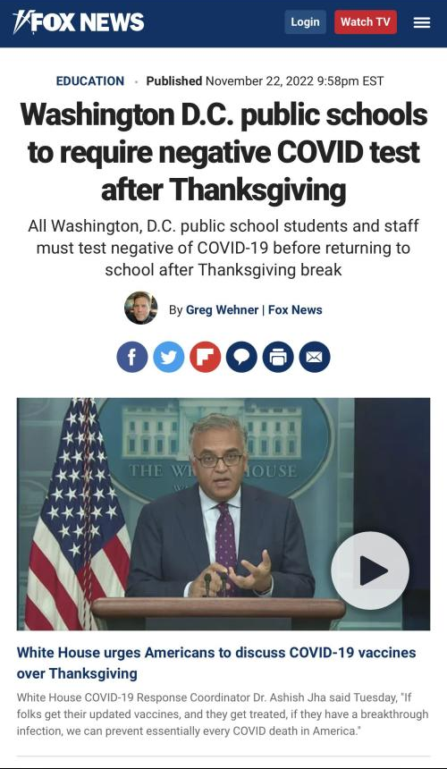 再来看2022年11月22日的一个新闻:华盛顿特区公立学校师生感恩节后回校时必须提供新冠阴性证明。