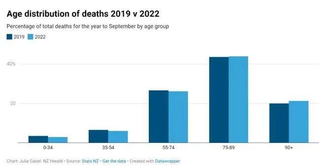 新西兰2019年和2022年去世者的年龄分布,变化不大
