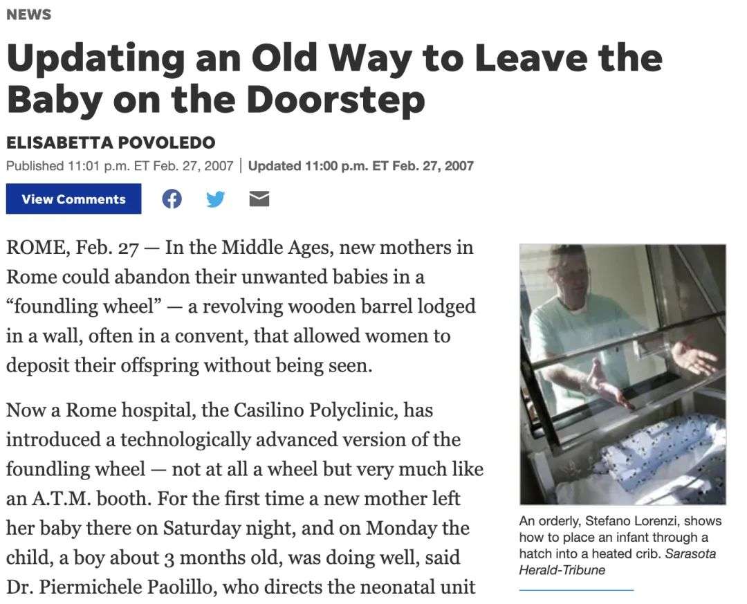 这些婴儿箱的用途和中世纪的“弃婴桶”相似,当时一些医院、教堂、孤儿院经常会放置一些圆桶在附近收集弃婴,避免未婚母亲把无法抚养的初生婴儿丢弃到树林中自生自灭…