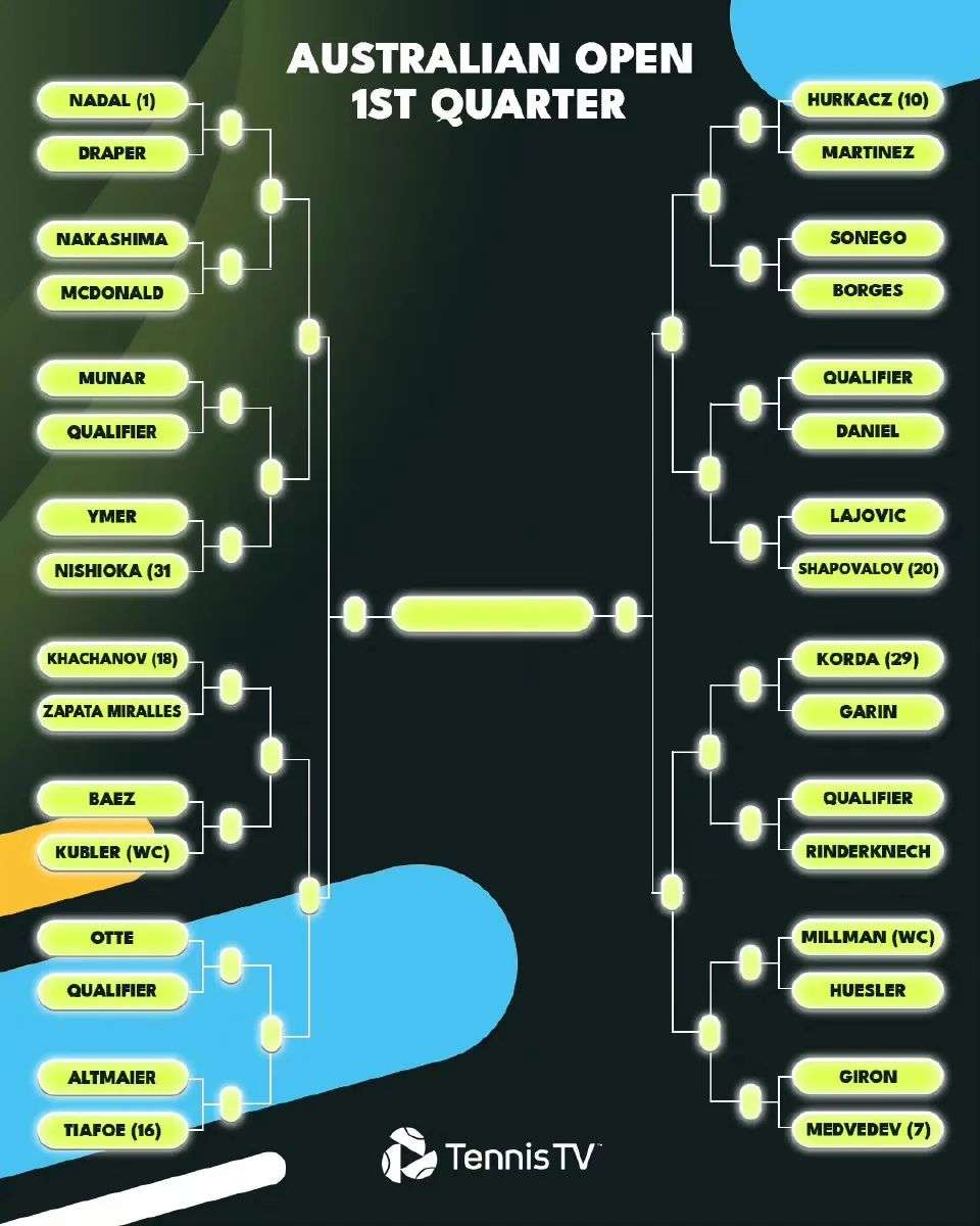 因为世界第一阿尔卡拉斯因伤退赛,卫冕冠军纳达尔将以头号种子的身份出征,他首轮的对手将是英国小将德雷珀。与之对位的前八种子则是去年决赛的对手梅德维德夫,后者首轮的对手是美国人吉隆。