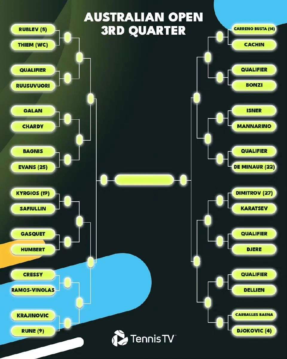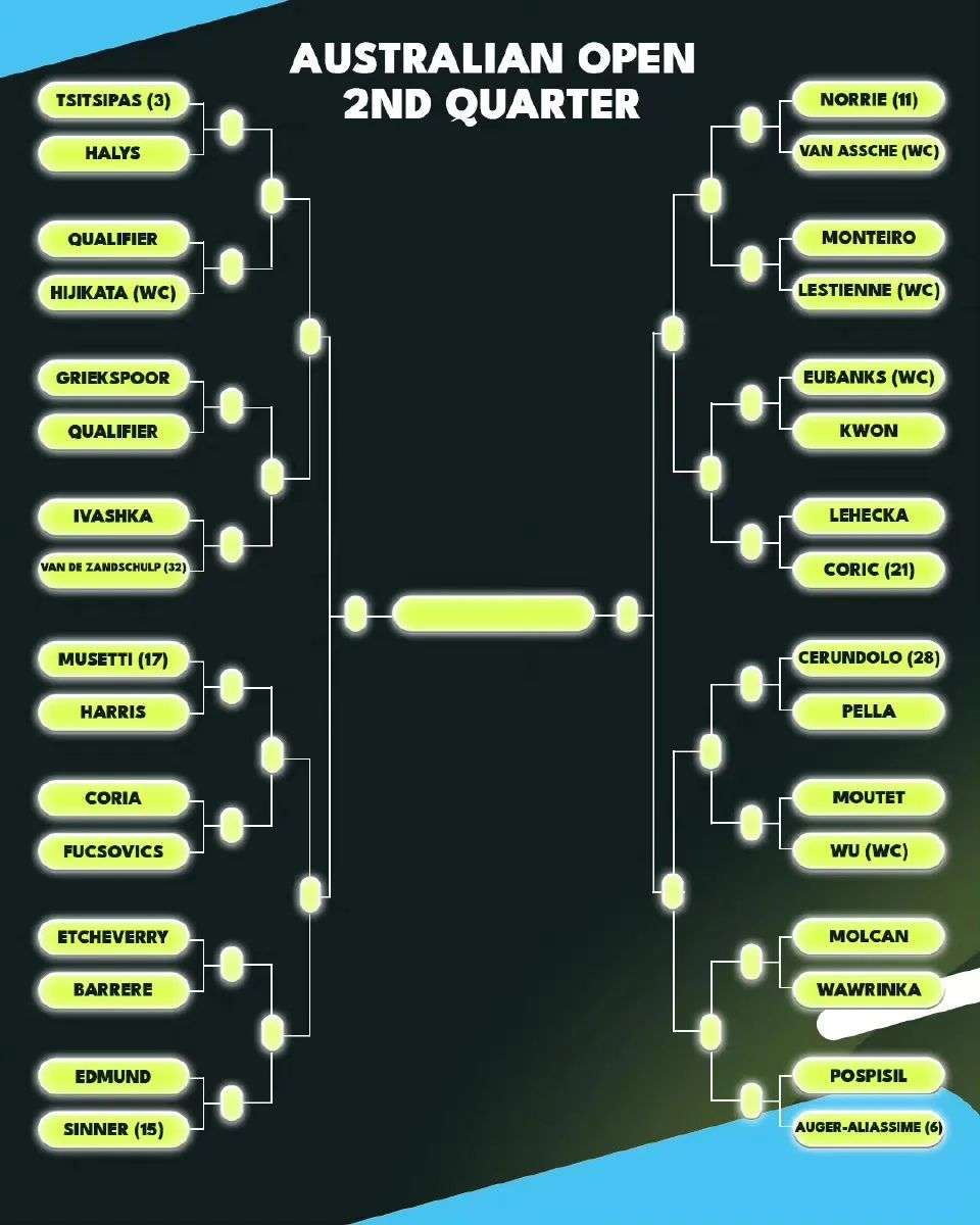 四分之二区由三号种子西西帕斯领衔,他已经三次打进澳网四强了。如果按照赔率和签位来看,很有可能继续在半决赛遭遇老对手梅总。五号种子阿利亚西姆的首轮对手则是波斯皮希尔。该区的大种子球员还有十一号种子诺里,喊出本赛季击败德约口号的他,不知道状态调整得怎么样了。
