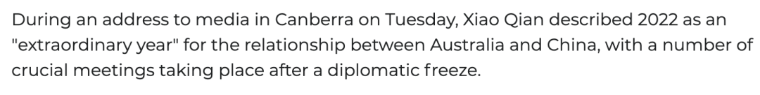 周二,在堪培拉对媒体发表讲话时,肖千大使将2022年描述为中澳外交关系“不平凡的一年”。