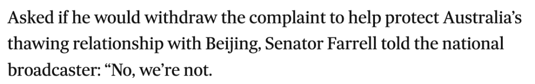 当被问及他是否会撤回投诉,以帮助保护澳大利亚与北京不断解冻的关系时,法雷尔参议员告诉国家广播公司:“不,我们不会”。