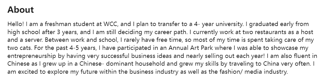当时,Jenna在社交媒体上表示:她希望在未来可以转到一个四年制的大学。为了补贴家用(尤其是父亲的治疗费用),Jenna还同时在两个餐厅打工。目前,她在社区大学的大一GPA是4.0。
