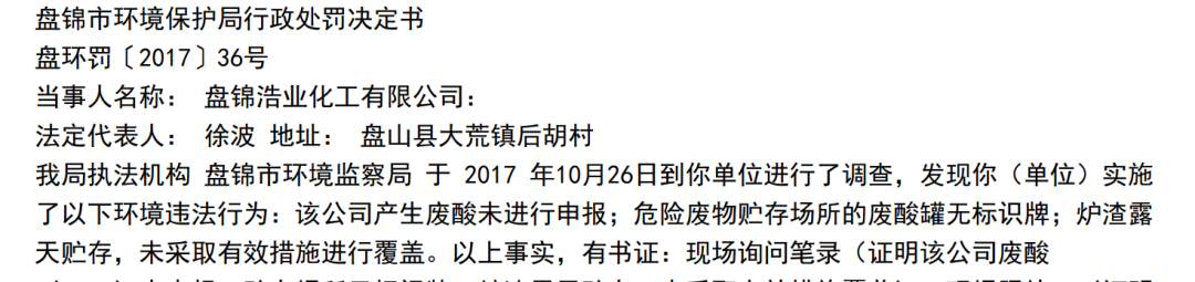 此外,2017年该公司曾因产生废酸未进行申报;危险废物贮存场所的废酸罐无标识牌;炉渣露天贮存,未采取有效措施进行覆盖等原因被盘锦市环保局罚款15万元。