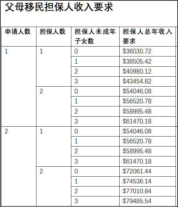 可以看出,如果经济担保人(不考虑配偶,除非配偶加入提供联名担保)没有未成年孩子,那么担保一个父母年收入仅需$36,030.72,担保父母双方仅需$54,046.08。这个年收入要求并不算高,考察的也仅是本财年和上财年的年收入情况,当然现实中的情况比较复杂,大家最好根据自己的情况计算清楚,做好充足准备。