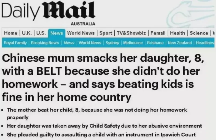 2019年的时候有个新闻引起了很多中国家长的重视,一位住在昆州的母亲因为8岁的女儿没有认真写作业,就用皮带抽打女儿,这位母亲自己不觉得有什么,并认为“这在中国很正常”。