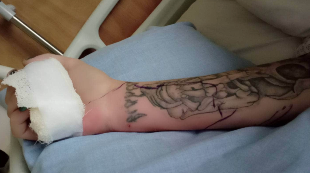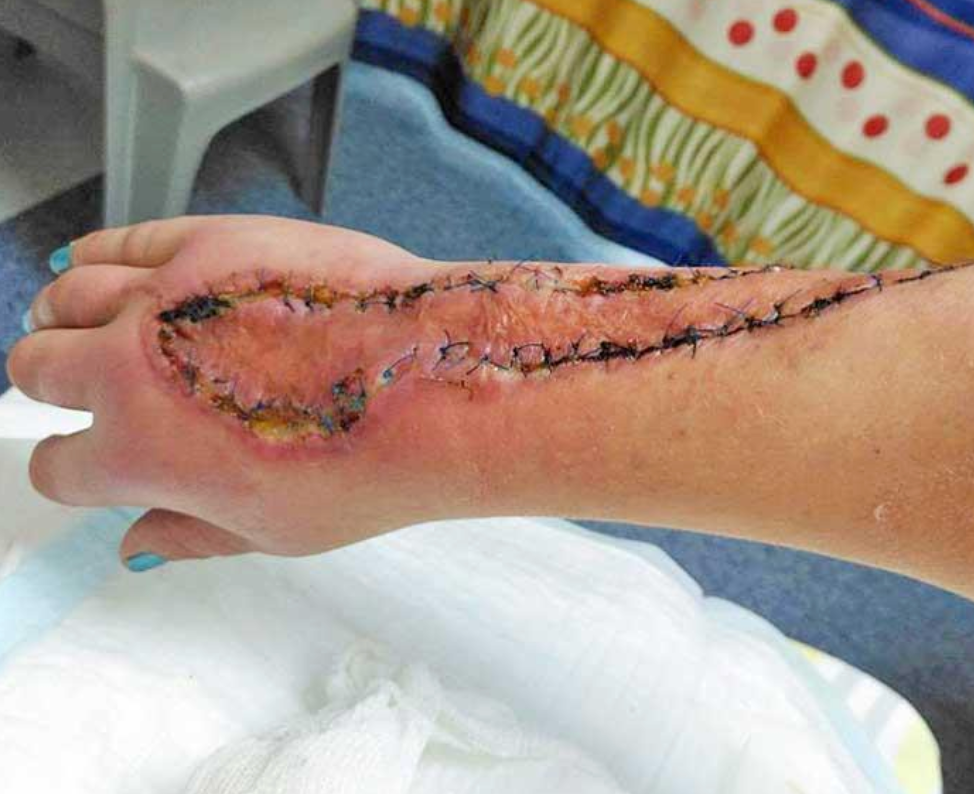 为了防止感染蔓延,医生的手术范围从她的手掌一直延伸到肘部,并且都有缝针。
