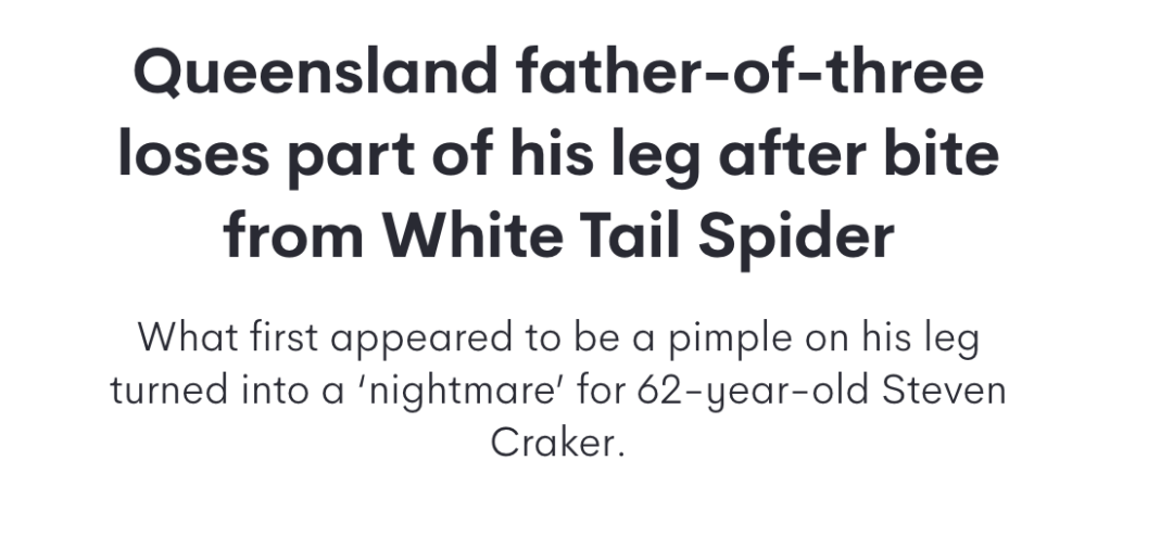 2017年,澳洲男子Terry Pareja在拜访家人时被白尾蜘蛛咬伤,随后他体内产生了一种超级可怕的食肉毒素,导致他双腿被截肢,双臂也岌岌可危,并需要在医院住12-18个月……