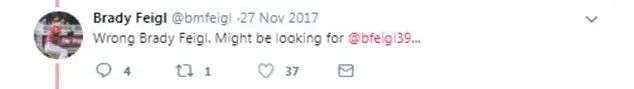 显然布雷迪·费格尔2号也意识到了这个问题,他发现密西西比大学棒球队错误的@了自己,便在官方账号下面留言:“哥们你@错了,你要找的应该是@bfeigl39...”相信他也已经把另一个费格尔的账号仔细研究了一番...