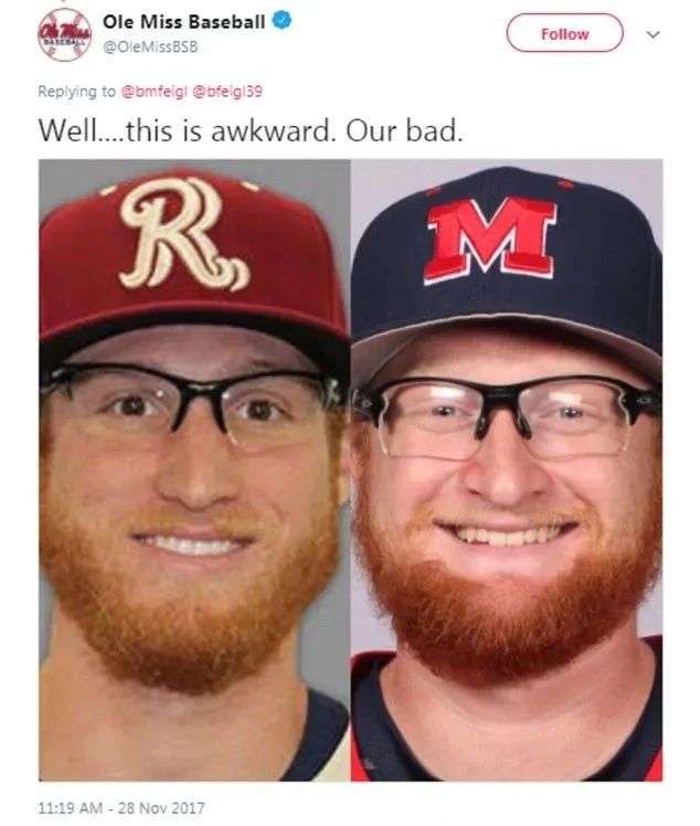 “好的...这太尴尬了,是我们的错...”密西西比大学棒球队回复到,还贴上了两人的照片,不过心里大概是想说:你们两也太像了,不怪我...
