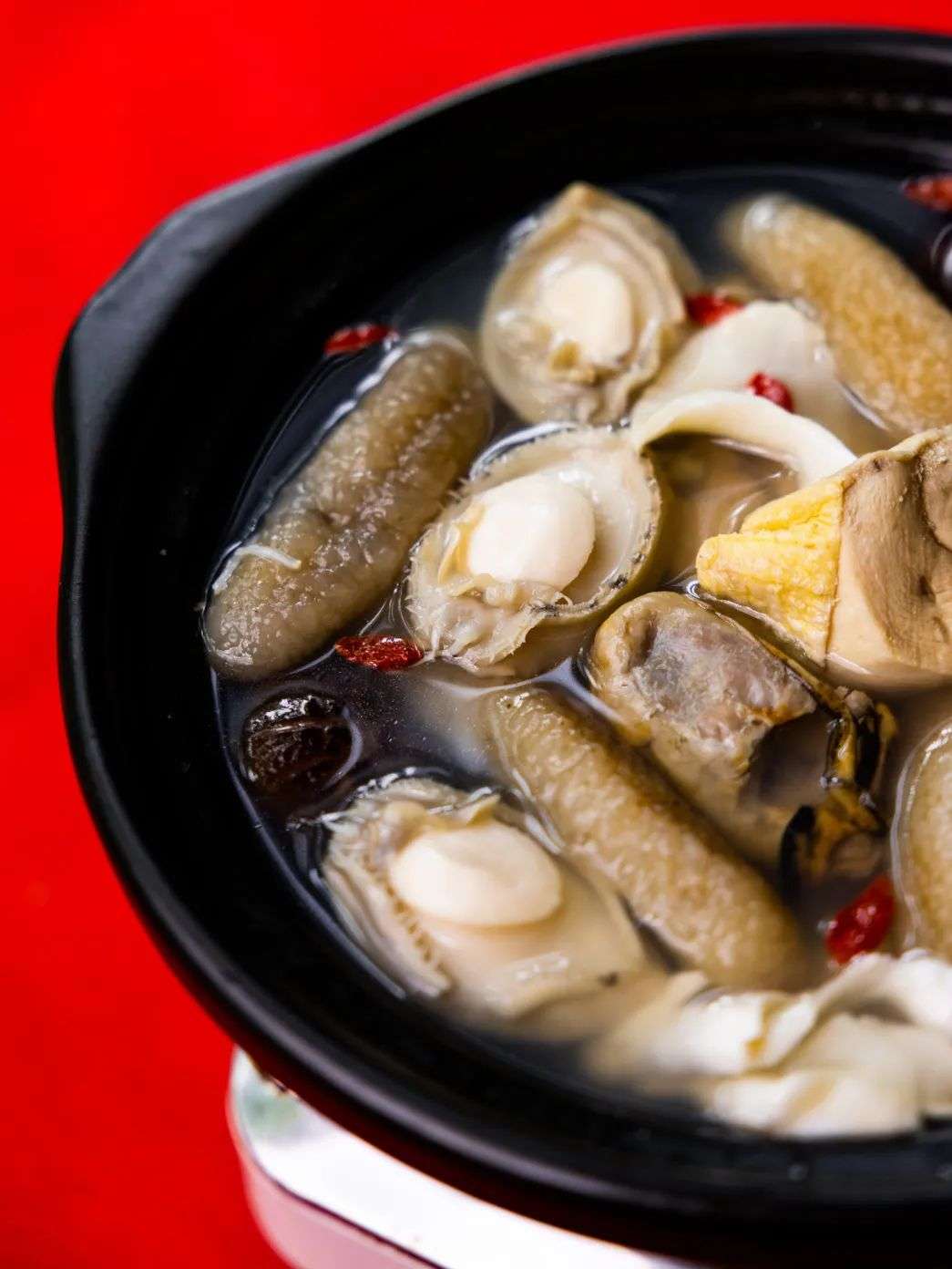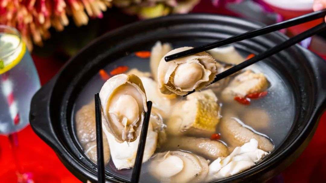 热气飞腾巨型锅子不要太豪华,鲍鱼、猪手、海参、鱼肚、带子、蠔、大虾、扣肉、雷笋、冬菇、豆泡、发菜...18种好料在向食客们招手!