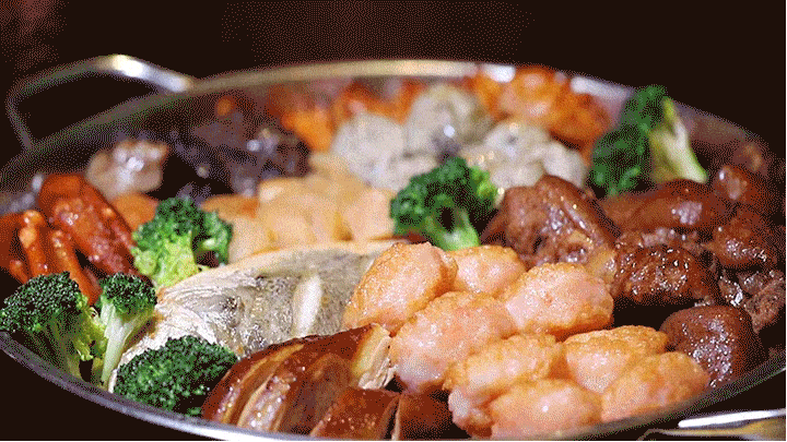 聚宝盆:中厨这一锅比往常的盆菜PLUS可以说是想当 丰盛了!一锅就荟萃了鲍鱼、海参、大虾、北极贝、花胶等多种珍贵食材,吃了ta来年一定更加兴旺发达!