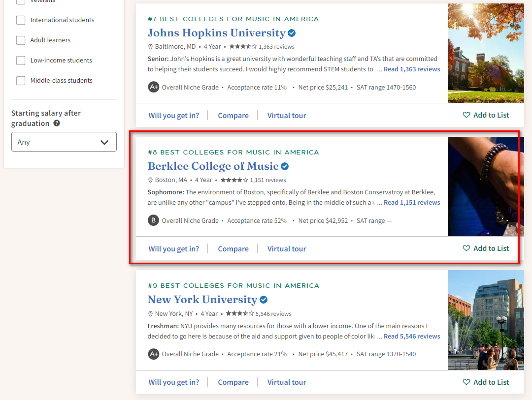有网友留意到,主流的留学类榜单(比如U.S. News)上根本找不到伯克利音乐学院的名字(因为根本没上榜)。