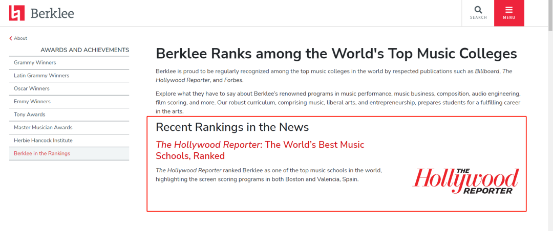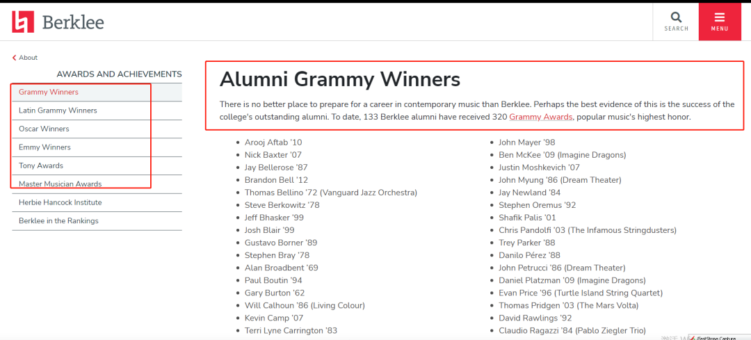 伯克利音乐学院的官网还专门汇总了近期伯克利的排名表现,以及校友们曾获得过的音乐奖项。