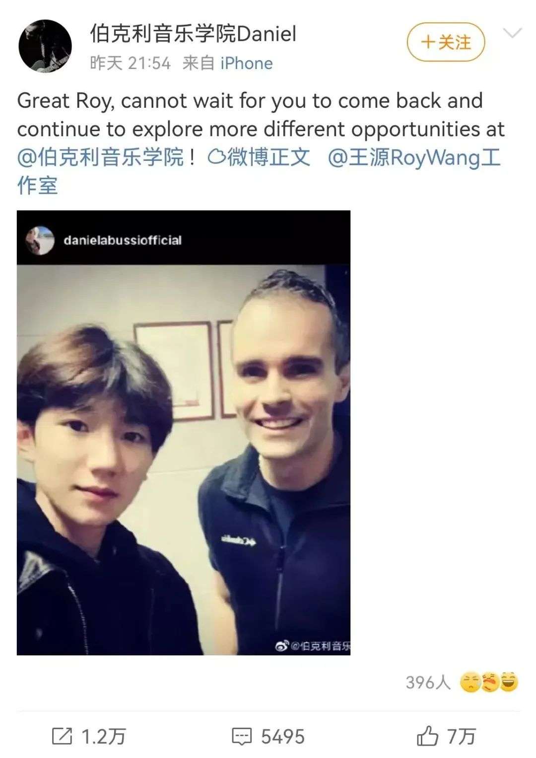 就在前几天,音乐学院的招生官Daniel发表了一则欢迎王源返校的微博,并附跟王源的合照。