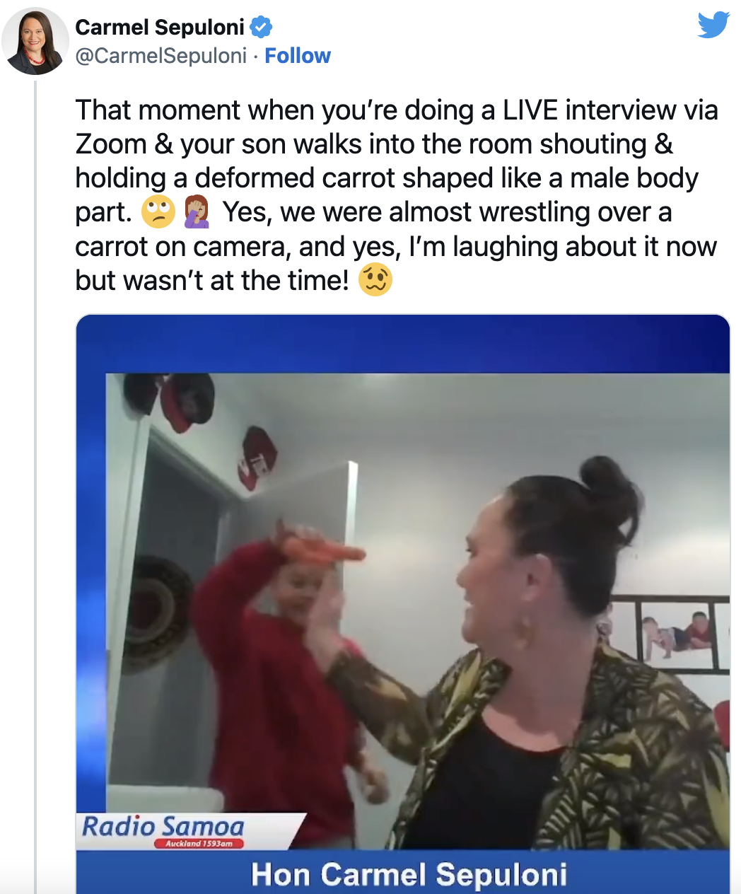 事后,Sepuloni在推特上载相关视频,并写道:“当你通过 Zoom进行直播访问的时候,你的儿子走进房间大喊大叫,手里还拿着一根形状像男性某个身体部位的畸形胡萝卜。”
