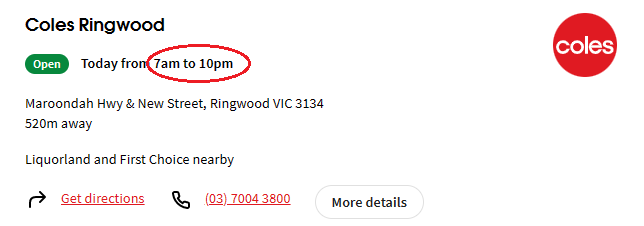 “之前Ringwood、Mitcham这两家都是11点。”看到大家的讨论,帮主于是分别去 Google 和 Coles 官网查询了一下Ringwood Coles的营业时间,看是不是真如大家所说的那样有差别:Google: