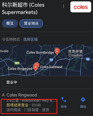 看来的确如群友所述,Coles官网已经调整了最新营业时间,但Google上大概还没更新。帮主在下面列出了墨尔本各大华人区Coles今天的营业时间,方便大家查询:
