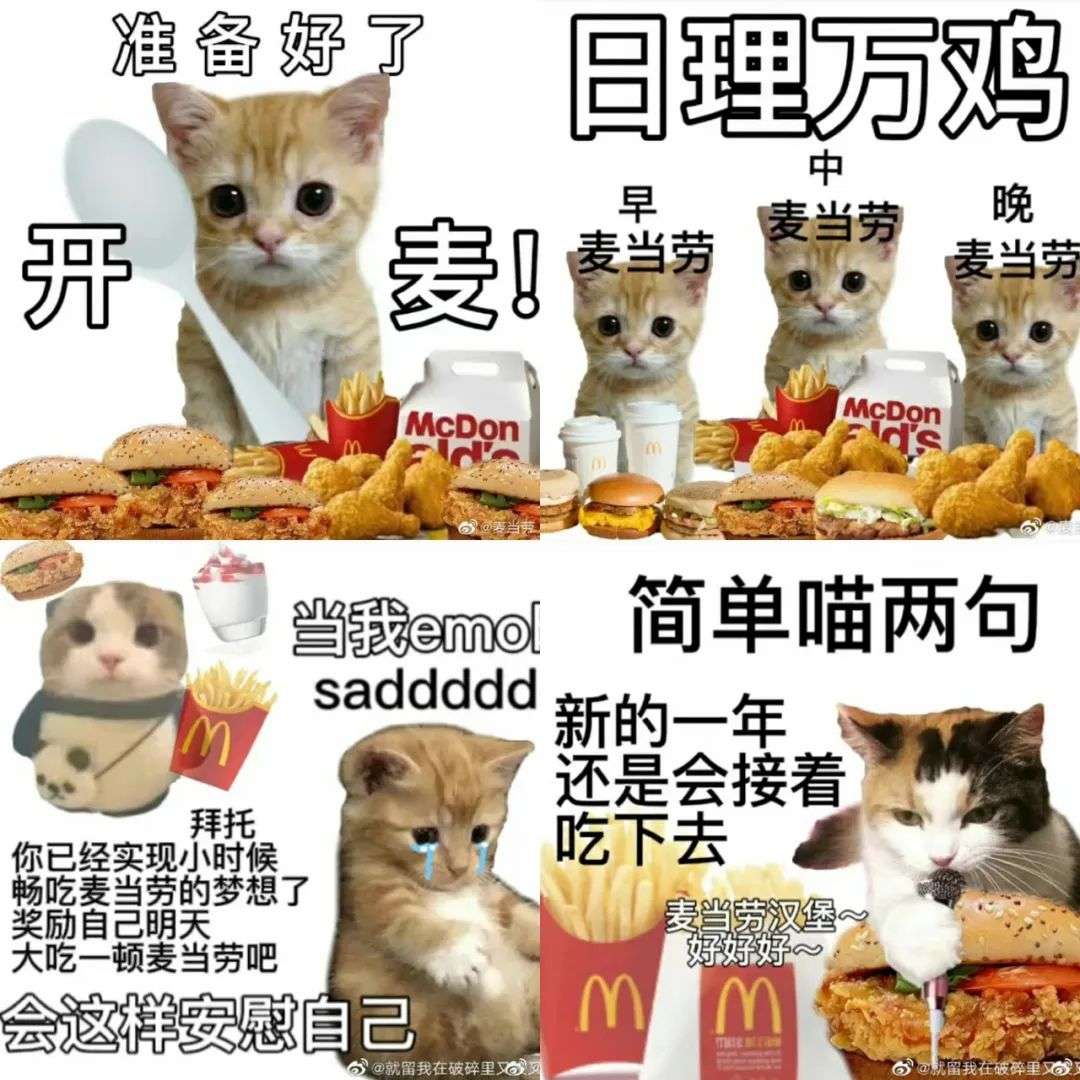 除了文字,表情包也是大家施展才华的练兵场。猫猫狗狗等小动物,成为了麦粉代言人,眼神散发着对麦当劳的无限渴望,嘴角挂着对麦当劳的无限期待。