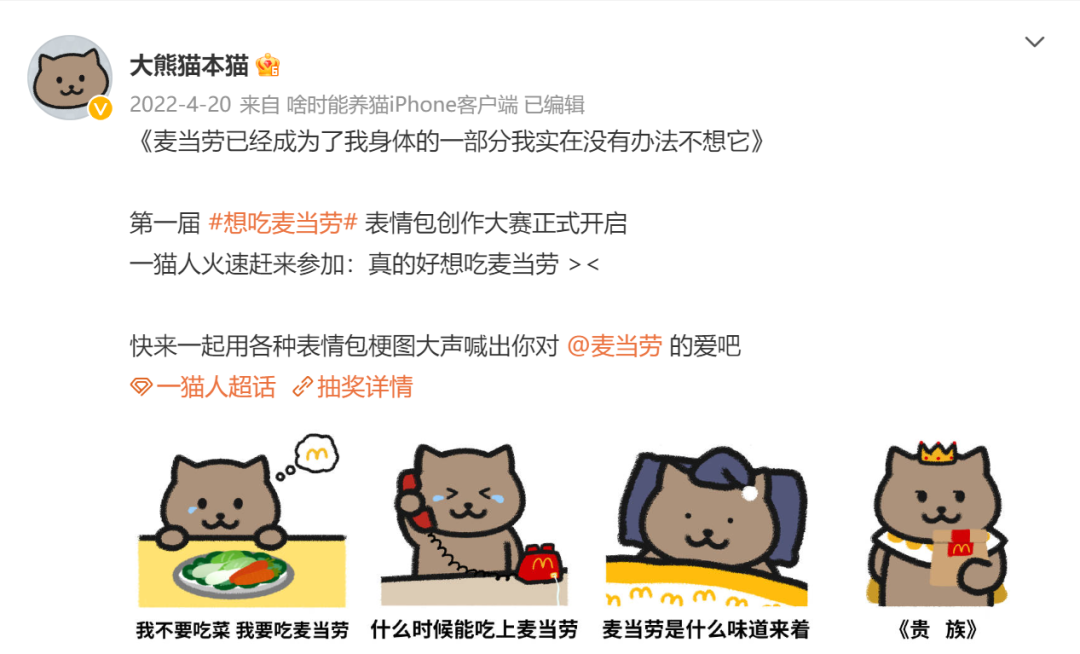 麦当劳还曾经和画家@大熊猫本猫合作,产出了非常有名的“一猫人×麦当劳”表情包。