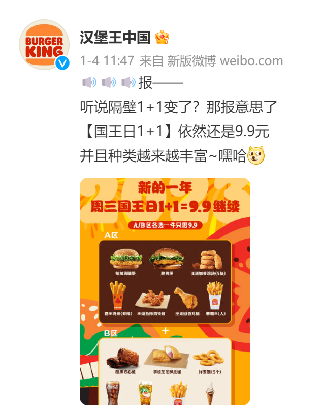 再加上汉堡王最近还推出了“国王日1+1=9.9元”的活动,发“麦难财”。看来穷鬼套餐很快要更名改姓了,其中一小拨人甚至已经开始宣称“麦门”就要变“汉门”!