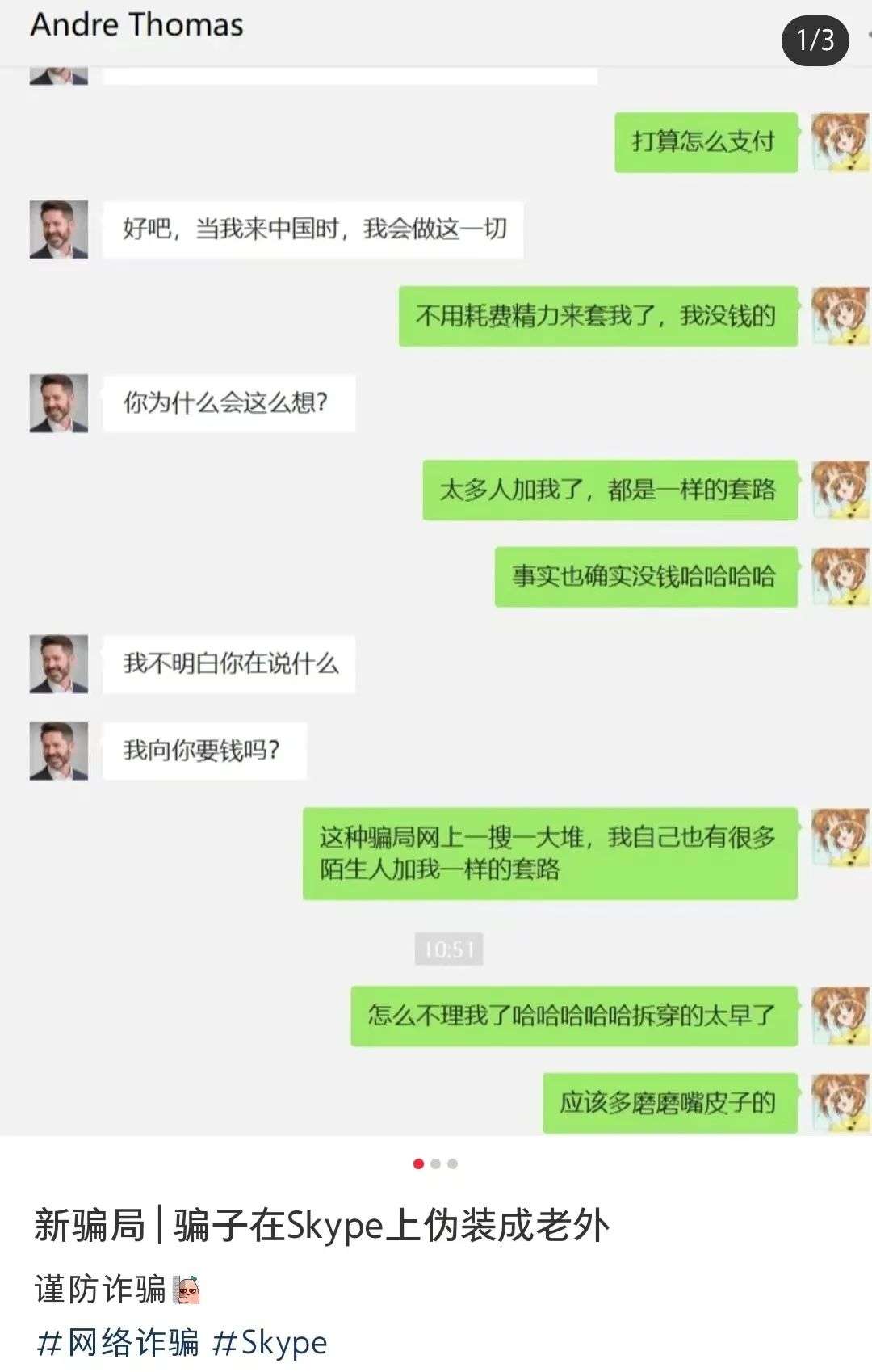 但凡在聊天过程中,对方开口借钱或投资的、要求我们给出真实信息的(比如说住址)或者要求看照片的,哥只有两个字的建议: