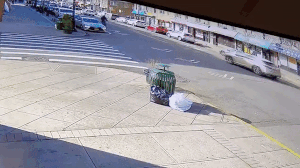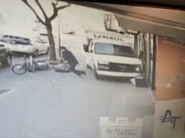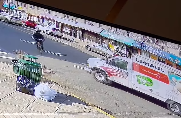 在他行驶路线上的一些商店的监控录像显示,他直接撞上了一名骑自行车的人,视频令人心惊肉跳。