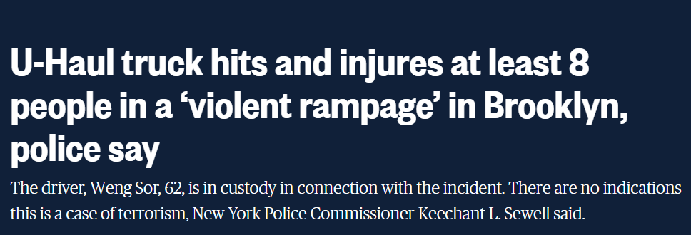 星期一上午11点左右,一辆疯狂的U-Haul小型卡车突然在布鲁克林狂飙,期间撞倒了至少8人。