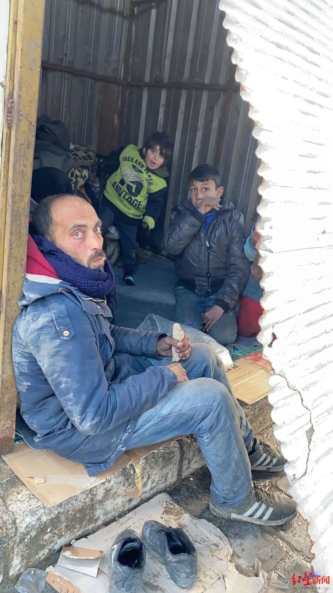 一张他拍摄的照片显示,一家叙利亚人在一个载货小板车的平板上支起了架子、套上了塑料罩。这样,他们就搭起了一个小小的家。另一张照片显示,一家人住在一个路边荒废的小棚子里,一位父亲手里拿着没吃完的大饼,两个孩子好奇地看向来访的人。还有一段视频记录了灾区附近一个小学,里面住满了流离失所的叙利亚人。“学校里面都没有电,每一个教室都住了3、4个家庭。”