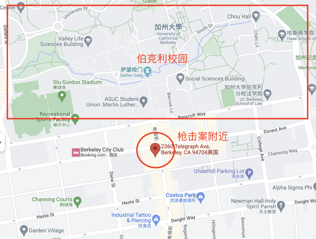 枪击案发生地点的100多米开外,就是UC Berkeley的学生宿舍。