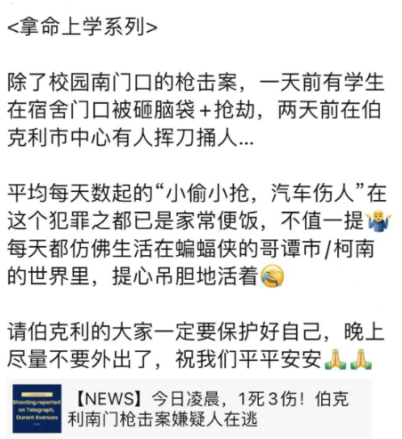 2022年10月的第一个周六凌晨,UC Berkeley的校门口发生了一起枪击案,最终造成1人死亡,3人受伤。