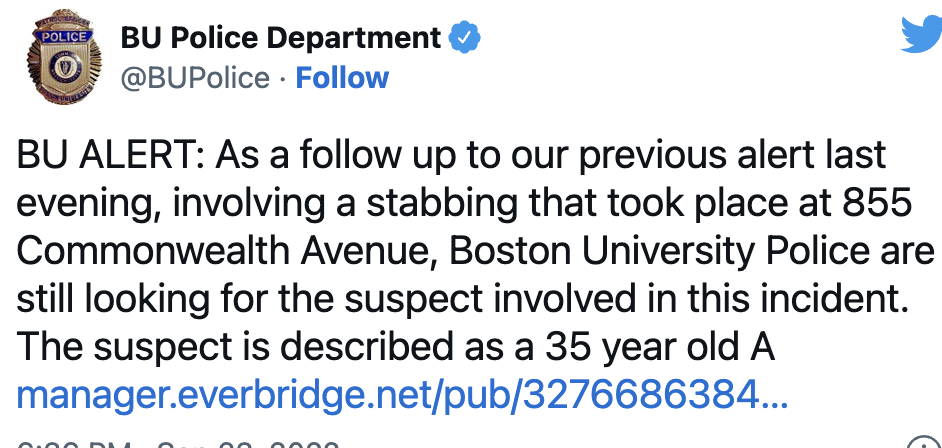 2022年9月22日晚8点30分左右,波士顿大学的艺术学院范围内发生了一起捅人事件。