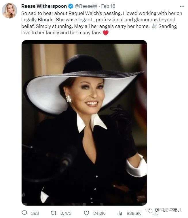 韦尔奇去世后,该片主演瑞希·威瑟斯彭还发帖向她致敬。