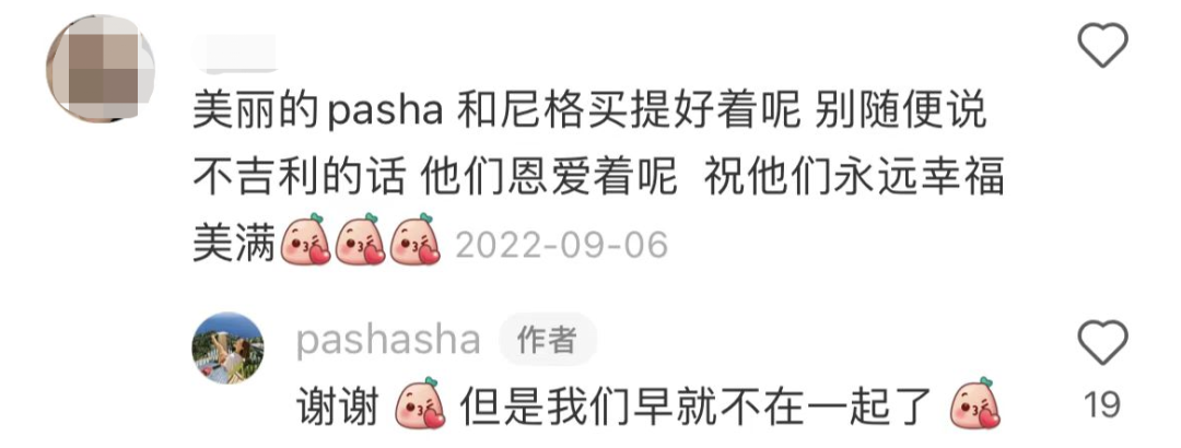 面对网络舆论,帕夏其实早已公开回应。在2022年9月,二人的婚姻再度引起争议,有网友在评论区发表了对她们婚姻的祝福。