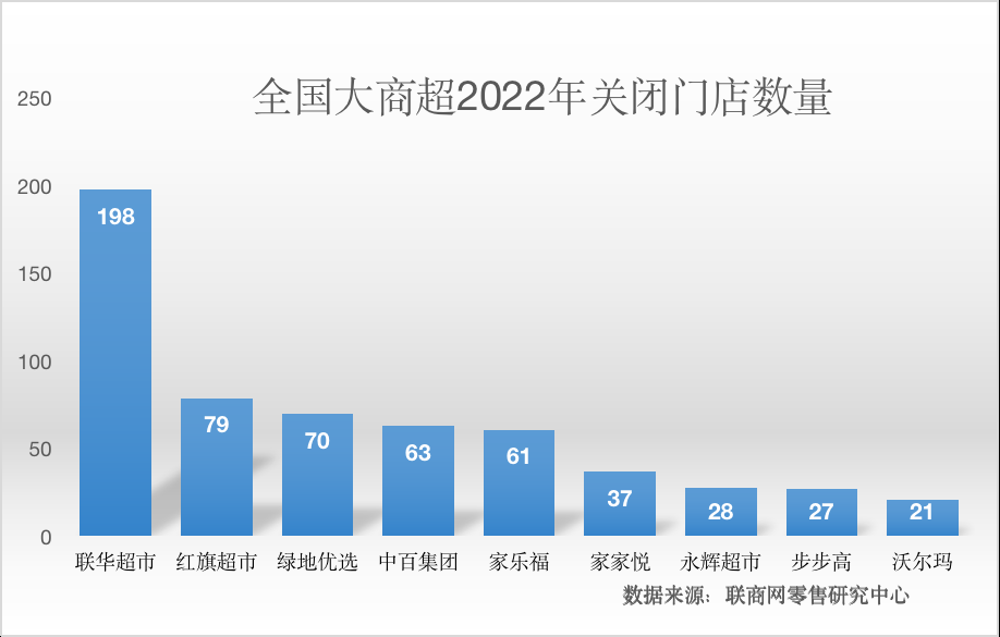 而据联商网零售研究中心不完全统计,家乐福、联华超市、红旗连锁、永辉超市、京东七鲜等34家超市企业,在2022年关闭门店超过680家。