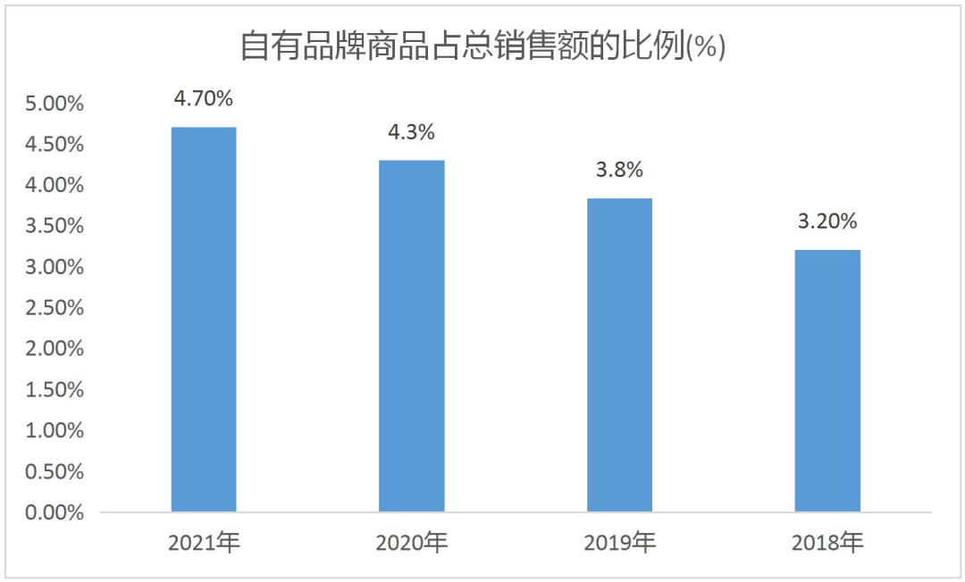而对于家乐福来说,全国统一提升自营比例并不是那么容易,那得不断试错和建设供给链路。而根据中国连锁经营协会发布的《连锁超市经营情况报告(2022)》显示,超市百强企业平均拥有自有品牌商品 SKU 数近千个, 销售占比仅为 4.7%。