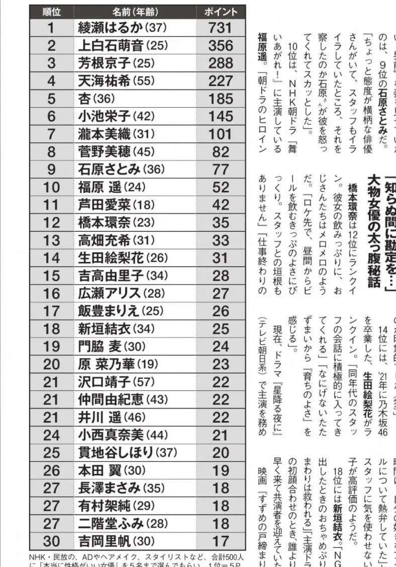 前段时间,周刊《FLASH》拿到了由广告代理店发起的“性格真正好的女艺人”的投票结果。