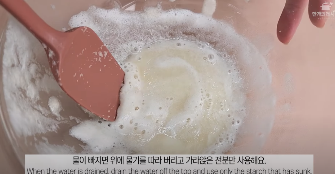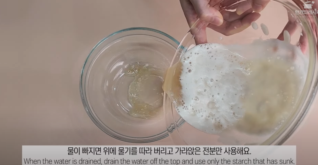 4. 放置一会儿,让碗里汁水的淀粉沉淀,然后小心的倒出上面的水,留下淀粉